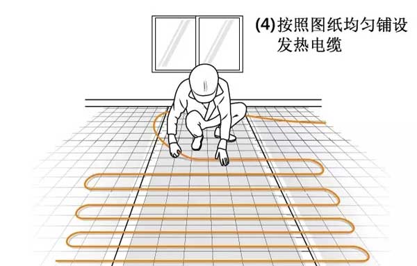 3、按照圖紙均勻鋪設發熱電纜;